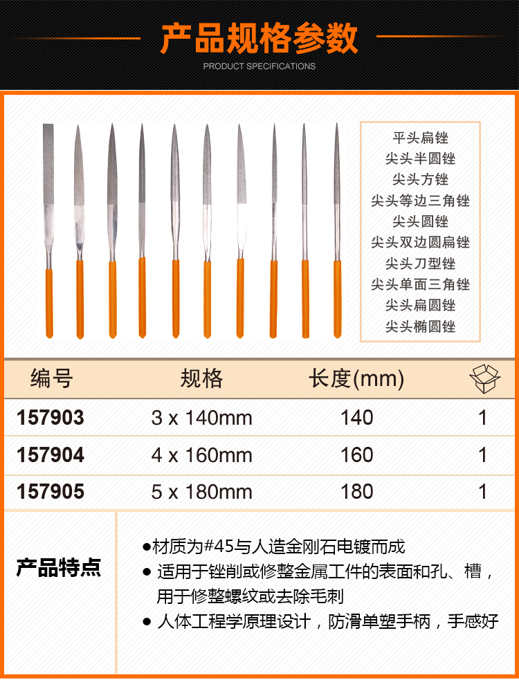 适用于锉削或修整金属工件的表面和孔、槽,用于修整螺纹或去除毛刺