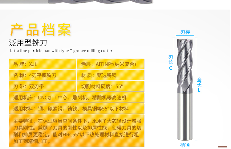 XJL—55°四刃平底铣刀(黑色涂层)—3.0*15*4*100L~20*80*20*150L...